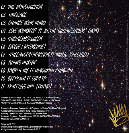 All albums and singles by NaTasha "Ms.Music" Rogers, from 2012 - 2015, were written, produced, played, engineered and mixed by NaTasha Rogers. Courtney Chadwick played saxophone on the Love. Peace. Music. EP.